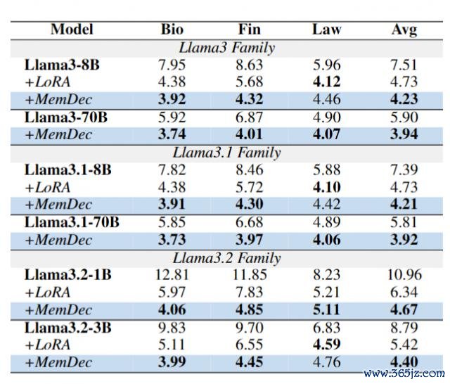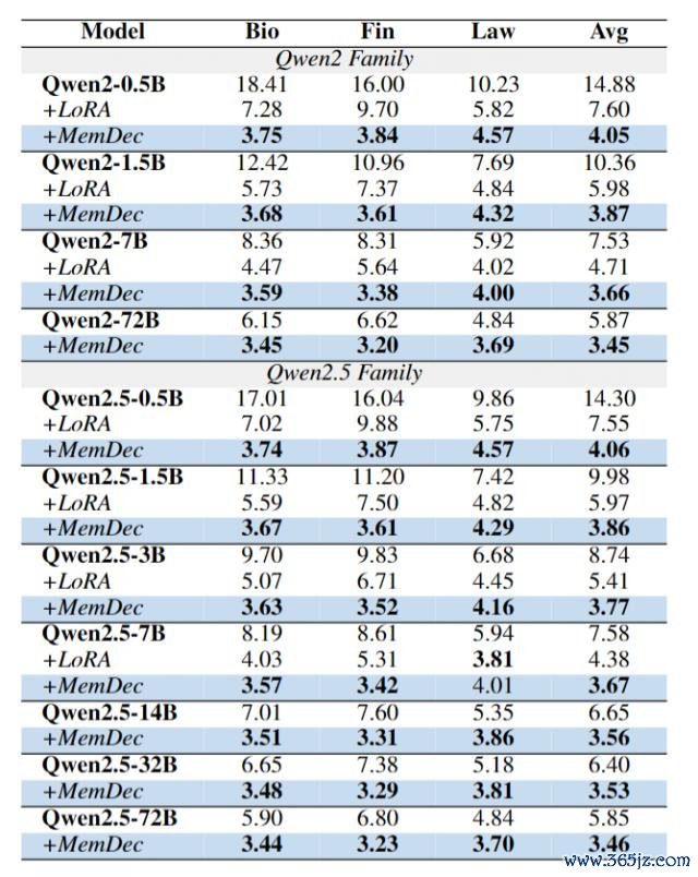 全体而言,在生物医学、金融、法律三个限制中,使用 Memory Decoder 的多种 Qwen 和 Llama 模子,平均缩小了 6.17 分困惑度,初步考证了 Memory Decoder 的有用性。