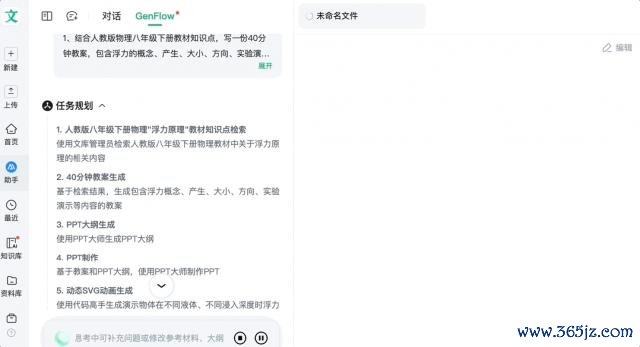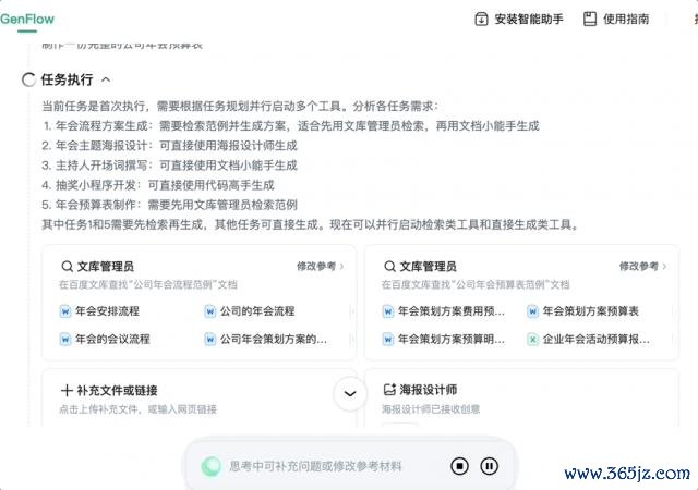 5 个任务输入后,文库 GenFlow2.0 启动念念考意会用户需求,自主筹划任务。