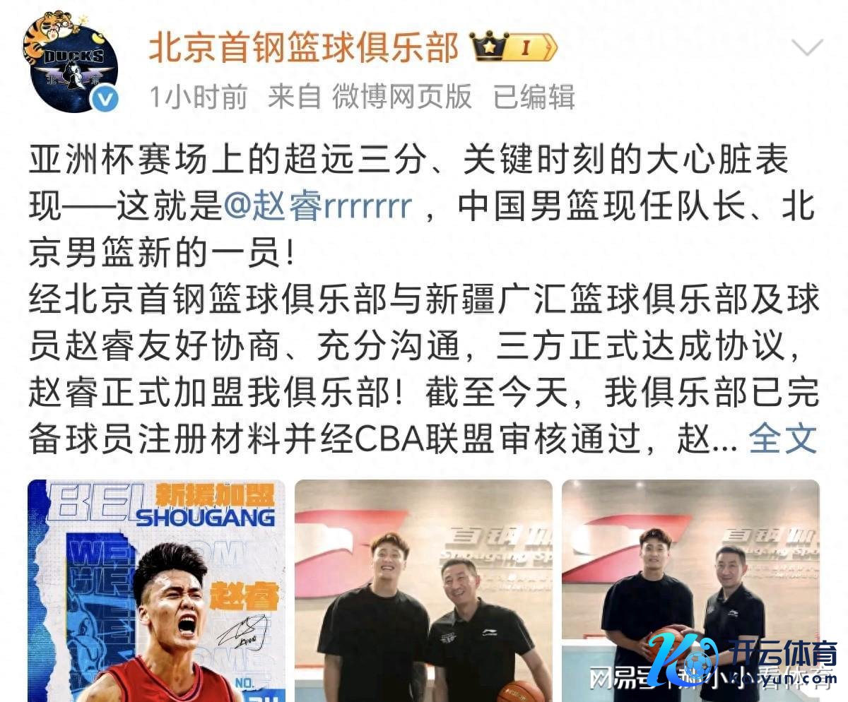 上赛季遵守于新疆男篮的赵睿,目下仍是完成了转会到北京首钢的沿途手续,况且仍是注册到了北京首钢新赛季的球员大名单中现金九游体育app平台,对于这笔往复有媒体暴露过,止境简便狰狞,即是赵睿换现款,北京首钢径直报出了一个连新疆男篮这种不缺钱的球队都无法拒绝的数字!