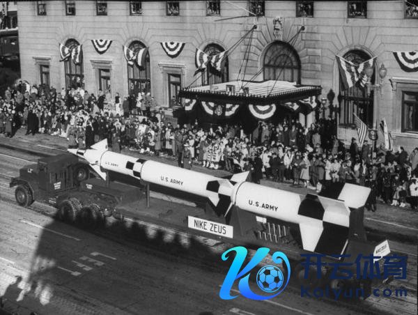 而好意思国1961年的检阅长这么,展示了其时好意思国多款先进导弹装备,比如下图的“Nike Zeus”反导系统: