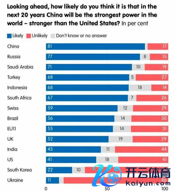 不外趁机说句公道话,好意思国东谈主在对华知道上如故算不那么离谱的,最离谱的是那些好意思国的傀儡国。比如本年刚好有一个针对列国的民心访问,问二十年后中国事否会在实力上特出好意思国: